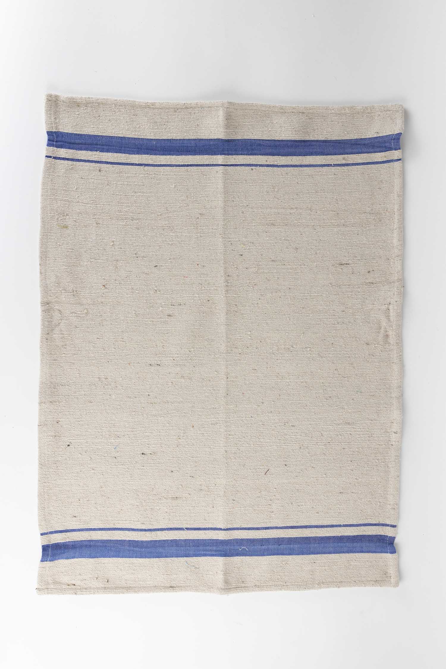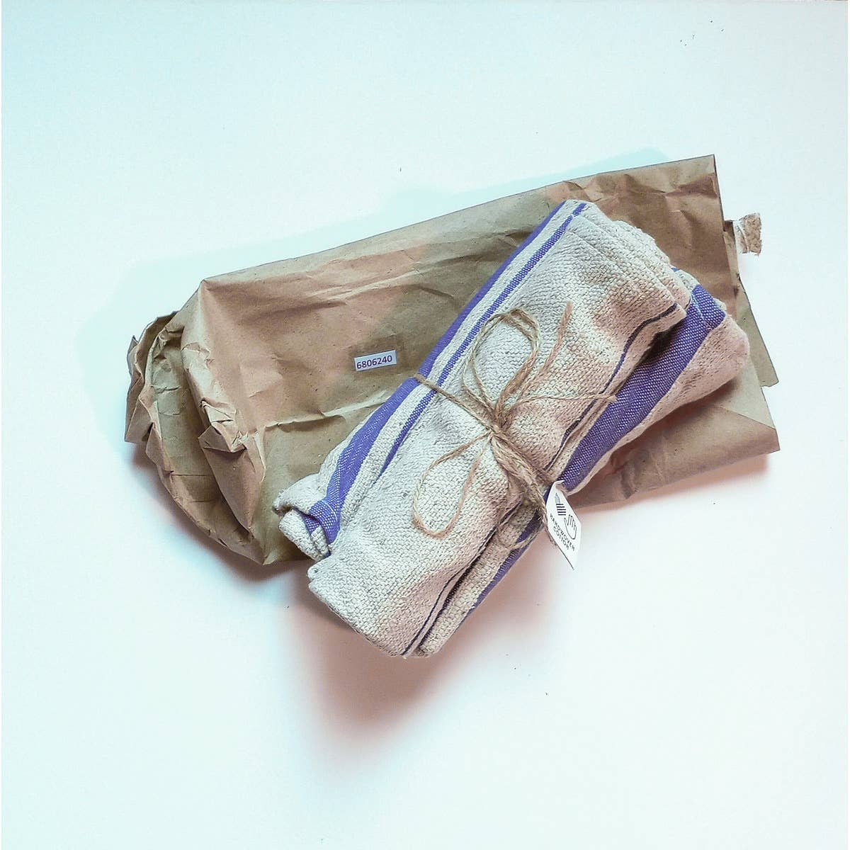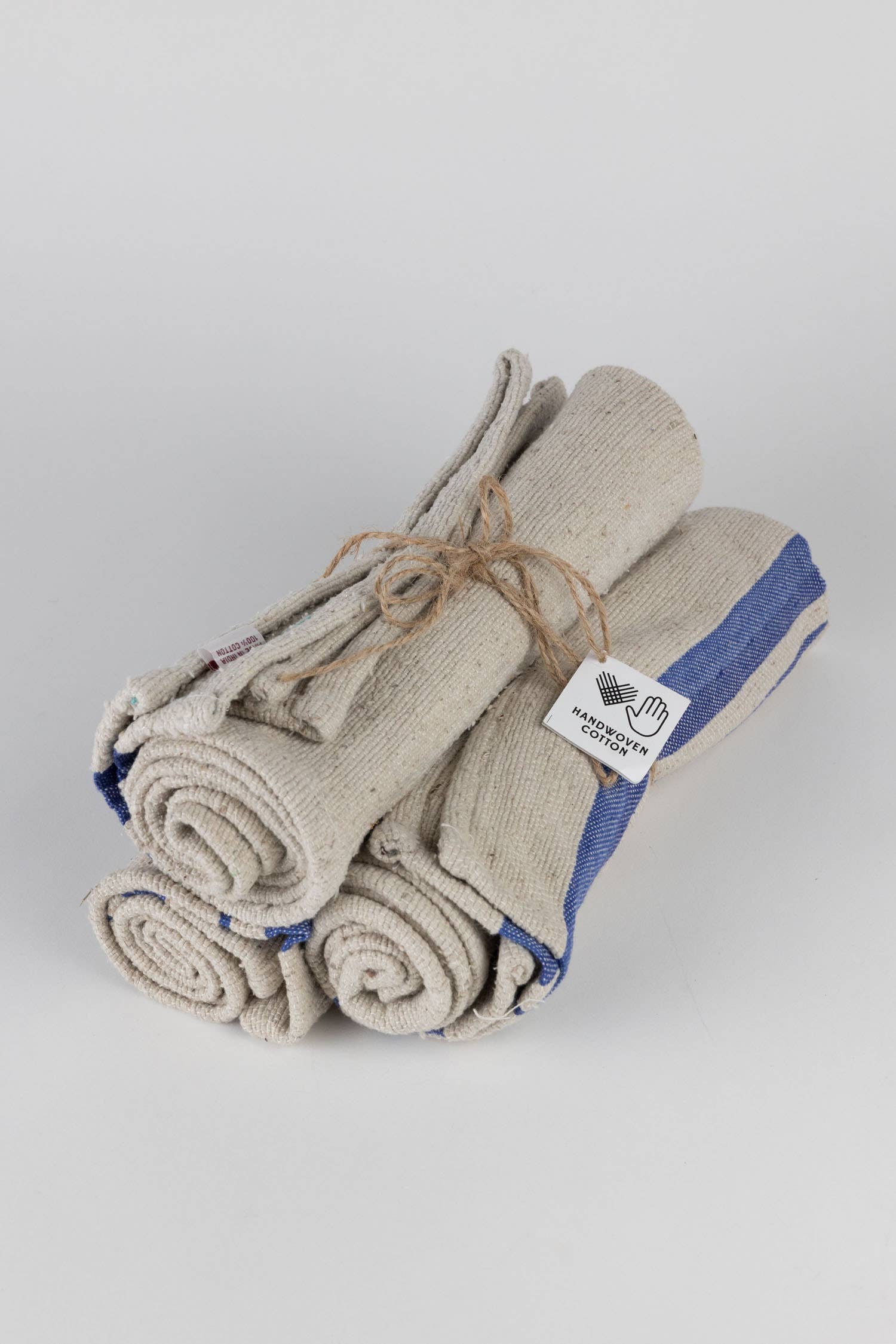 * Clearance item - available for a limited time. Materials: 100% cotton - Measures:29"L x 21"W each, sold in sets of three - Care: Warm wash. Tumble dry. Do not bleach. - Colors: Blue, natural tan - Pair with our Blue Tan Wide Stripe Dish Cloth (sold separately) - Handcrafted in India