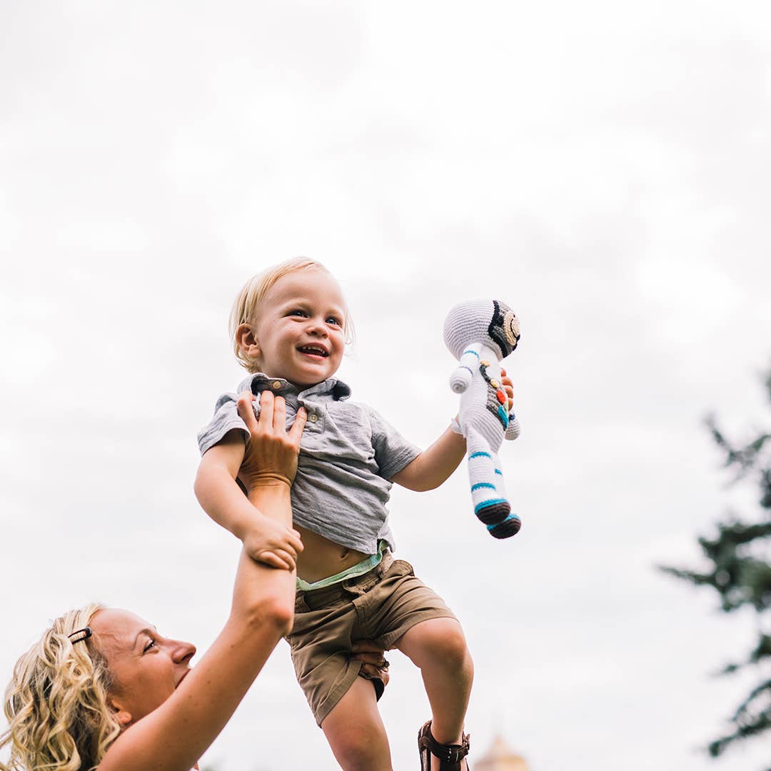 Time for take off! Meet your little shopper's new favorite astronaut. He enjoys exploring the solar system and is ready to fly to the moon and back. Perfect for hours of imaginative play, this astronaut kids toy is hand knit with soft cotton yarn.