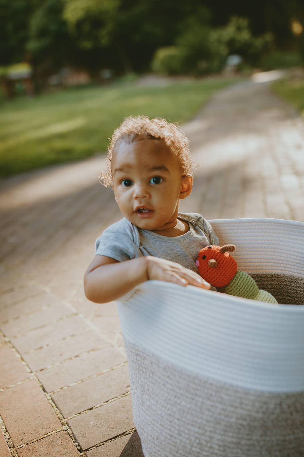 This cheerful plush garden toy is sure to worm its way into the hearts of your customers. Babies are drawn to the vibrant color of this soft toy and it is the perfect size for their small hands. This caterpillar is an attention grabber and looks great sitting on a shelf, paired with storybooks or as a gift topper.