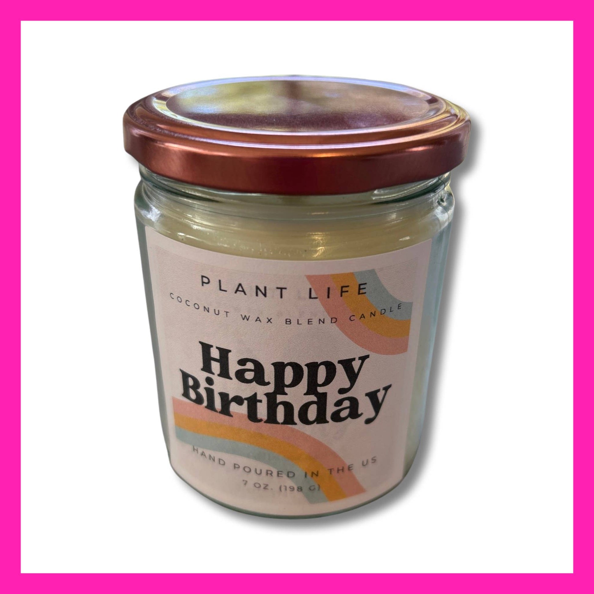 Happy Birthday glass candle. 9 ounce glass jar filled with 7 ounces of coconut soy wax, an eco wick, and premium fragrance! The candle is in the scrumptious scent of birthday cake - A great cake scent with an undertone of sweet vanilla.