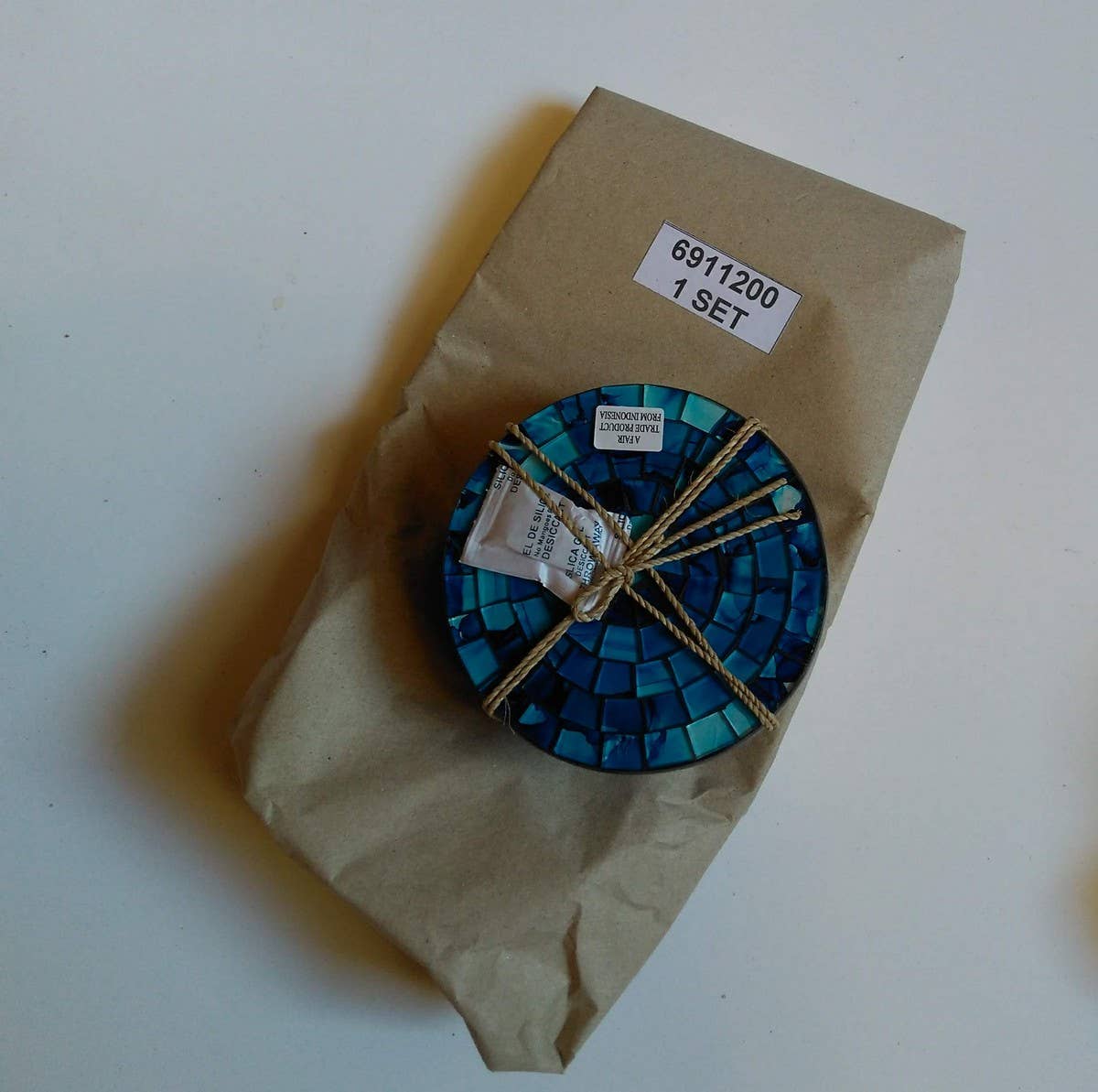 The Tropical Waters Mosaic Coasters are handcrafted of pieces of glass laid out in a concentric circle design on an MDF backing painted black. The shimmering shades of blue catch the light and transport you to a place much more tropical than your living room.